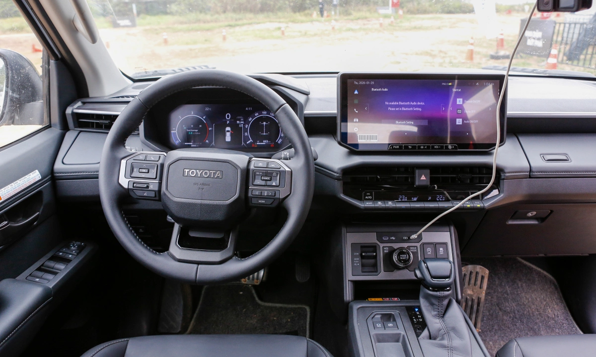 Nội thất được đại tu toàn diện, kết hợp công nghệ hiện đại với bản chất tiện dụng truyền thống của Hilux. Bảng điều khiển hình hộp và màn hình thông tin giải trí 12,3 inch độc lập và cụm đồng hồ kỹ thuật số 12,3 inch. Hỗ trợ kết nối không dây Apple CarPlay/Androi Auto.