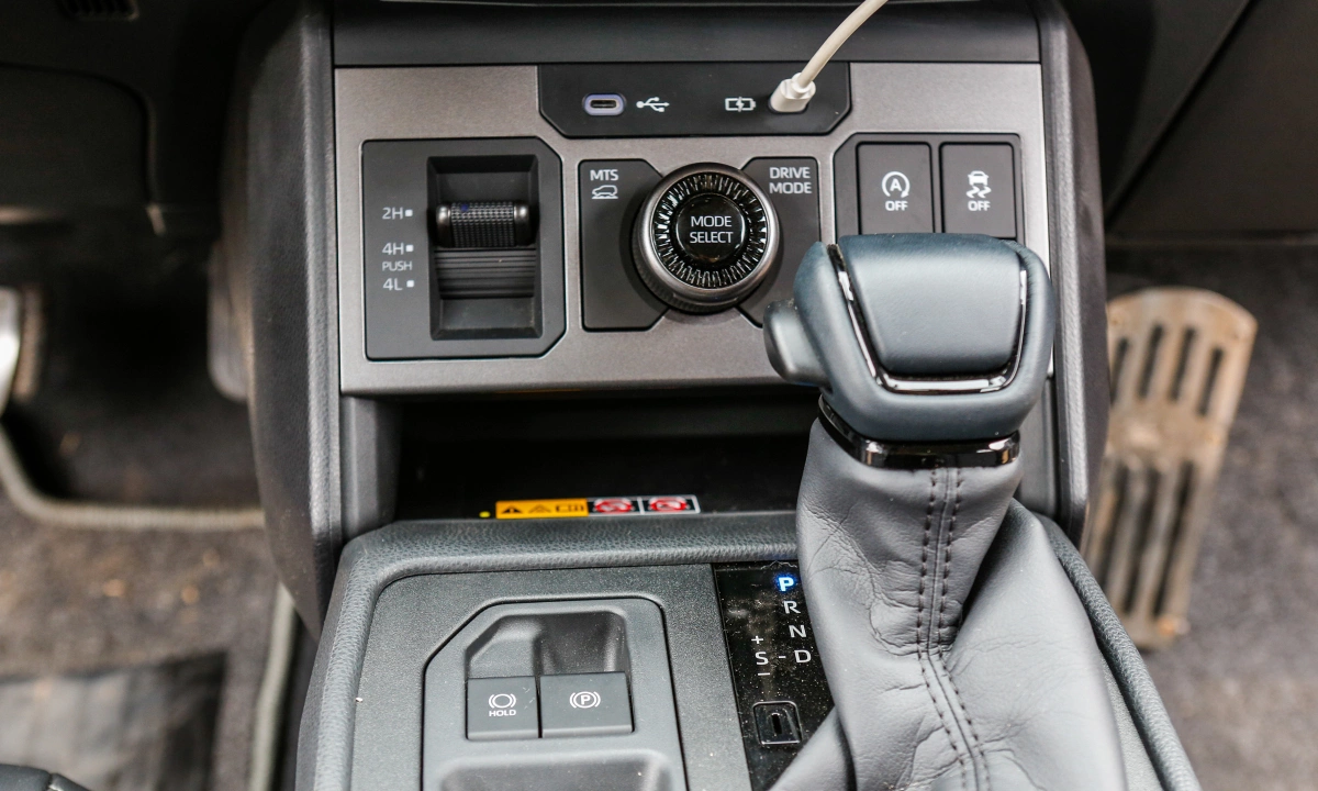 Núm xoay trung tâm lựa chọn chế độ lái, cần gạt gài cầu 2H, 4H hoặc 4L. Bản cao Trailhunter trang bị phanh tay điện tử, trong khi 2 bản thấp dùng phanh tay cơ.